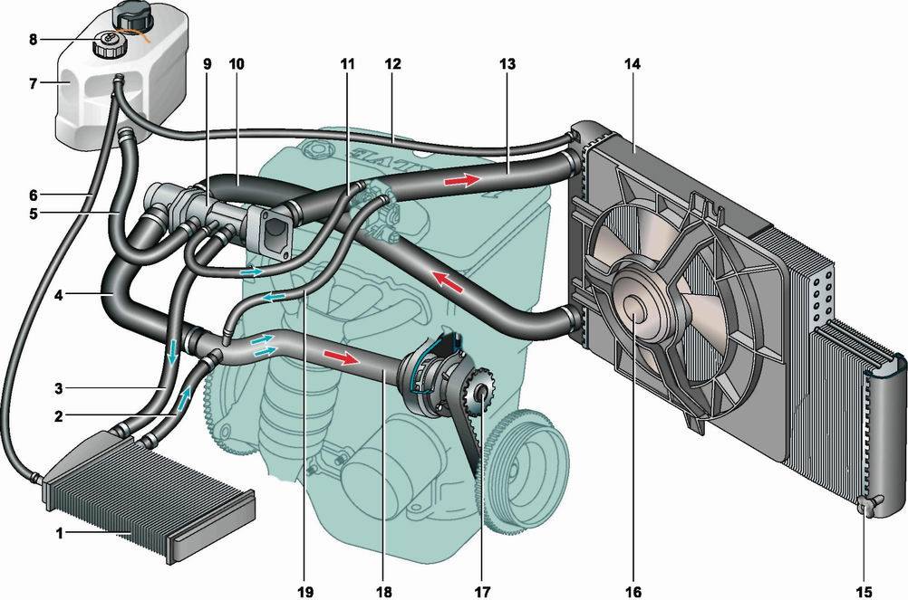 Система охлаждения : 1 — радиатор отопителя; 2 — шланг отвода охлаждающей жидкости из радиатора отопителя; 3 — шланг подвода охлаждающей жидкости к радиатору отопителя; 4 — шланг подводящей трубы насоса охлаждающей жидкости; 5 — шланг расширительного бачка; 6 — пароотводящий шланг радиатора отопителя; 7 — расширительный бачок; 8 — датчик уровня жидкости в расширительном бачке ; 9 — термостат; 10 — шланг отвода жидкости из радиатора двигателя; 11 — шланг подвода жидкости к дроссельному узлу; 12 — пароотводящий шланг радиатора двигателя; 13 — шланг подвода жидкости к радиатору двигателя; 14 — радиатор двигателя; 15 — пробка сливного отверстия радиатора; 16 — электровентилятор радиатора двигателя; 17 — насос охлаждающей жидкости; 18 — подводящая труба насоса охлаждающей жидкости; 19 — шланг отвода охлаждающей жидкости из дроссельного узла
