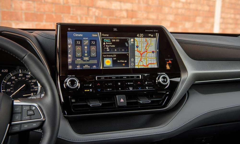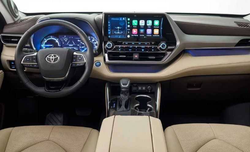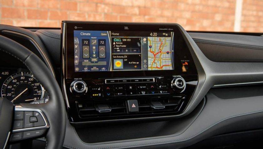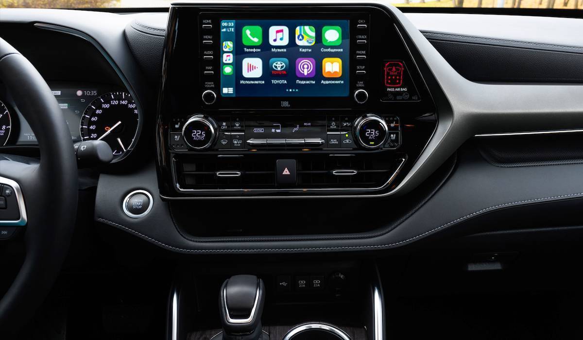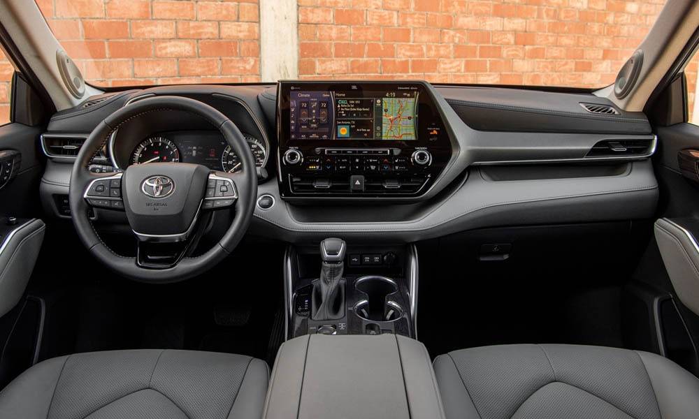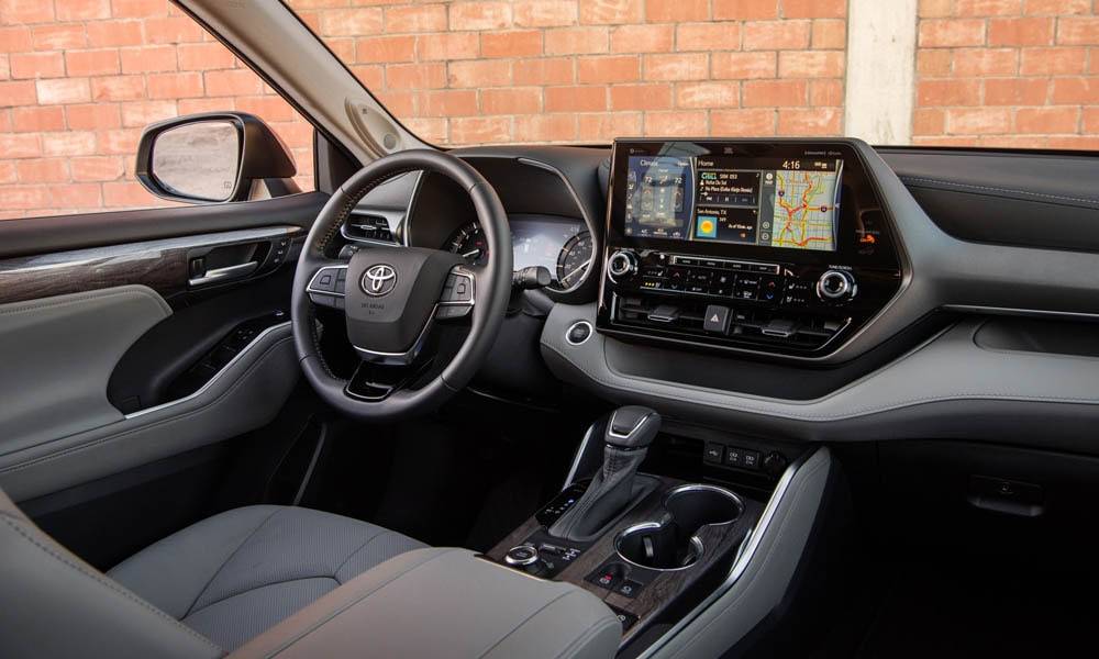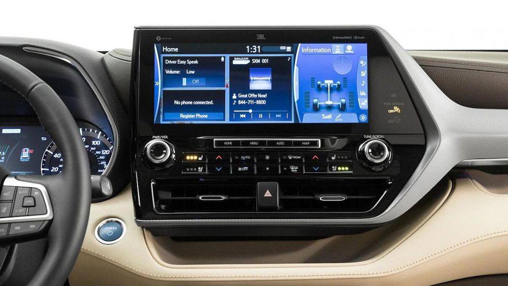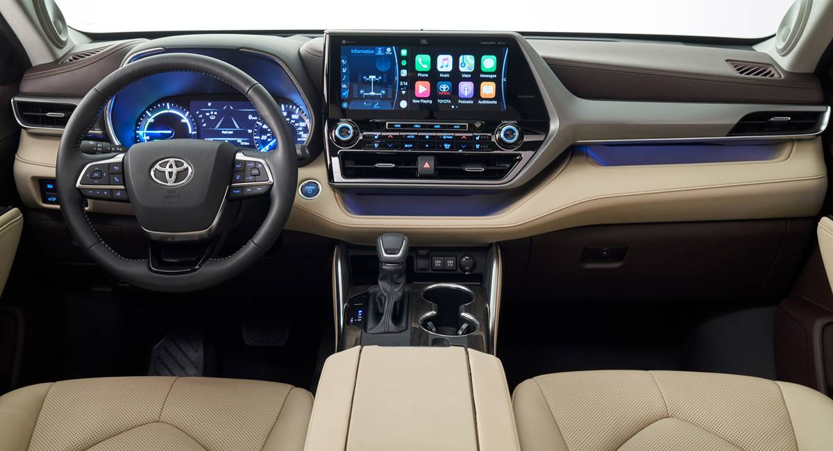 Для нового Тойота Хайлендер 2020 года также был подготовлен новый салон: на передней панели появились новые воздуховоды, а мультимедиа-центр и блок управления климатом визуально получили единую панель управления.