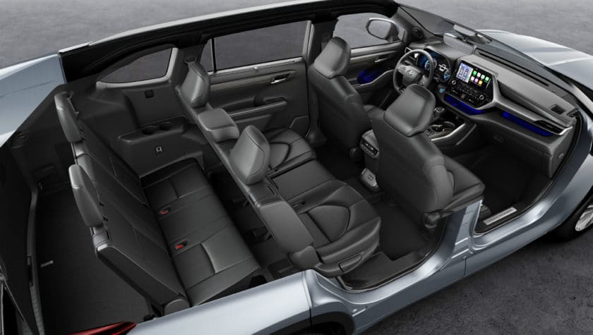 Отныне длина Тойоты Хайлендер 2020 составляет 4950 мм., причем, очередную прибавку в габаритах было решено использовать для увеличения пространства между сиденьями первого и третьего ряда.