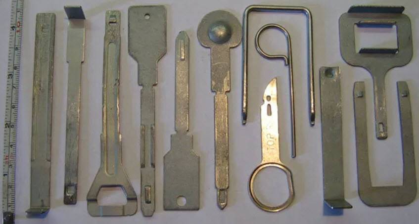 Вместо ключей можно использовать полоски из тонкого металла, канцелярские ножи или элементы разобранных каркасных дворников. Потребуется столько металлических заготовок, сколько технологических отверстий предусмотрено на магнитоле (как правило, 2 или 4).