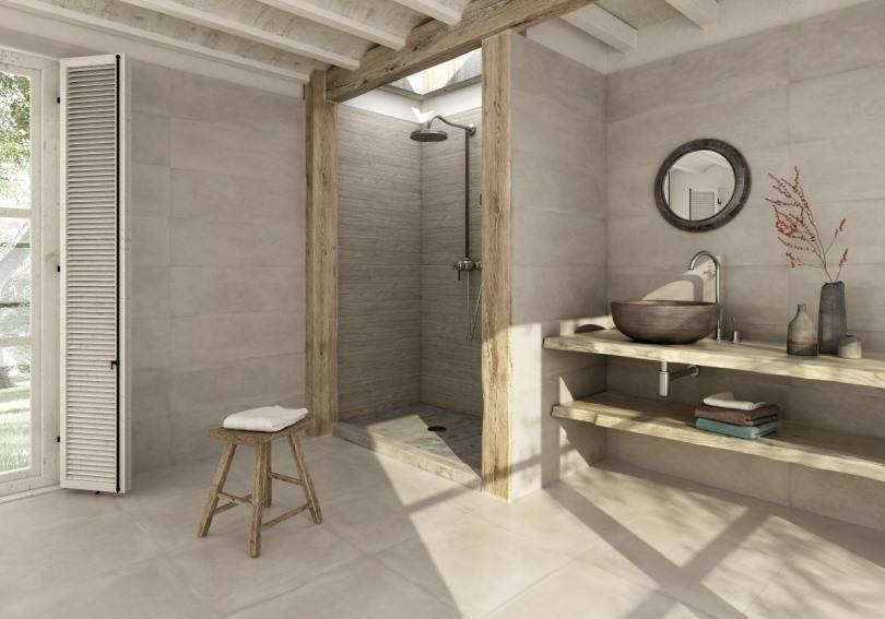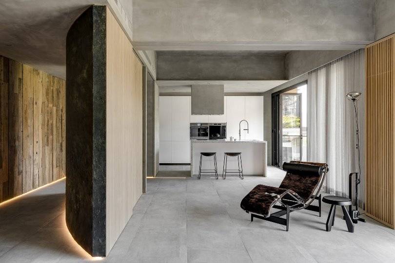 Натуральное дерево и серый бетон – отличная комбинация, создающая тепло и уют