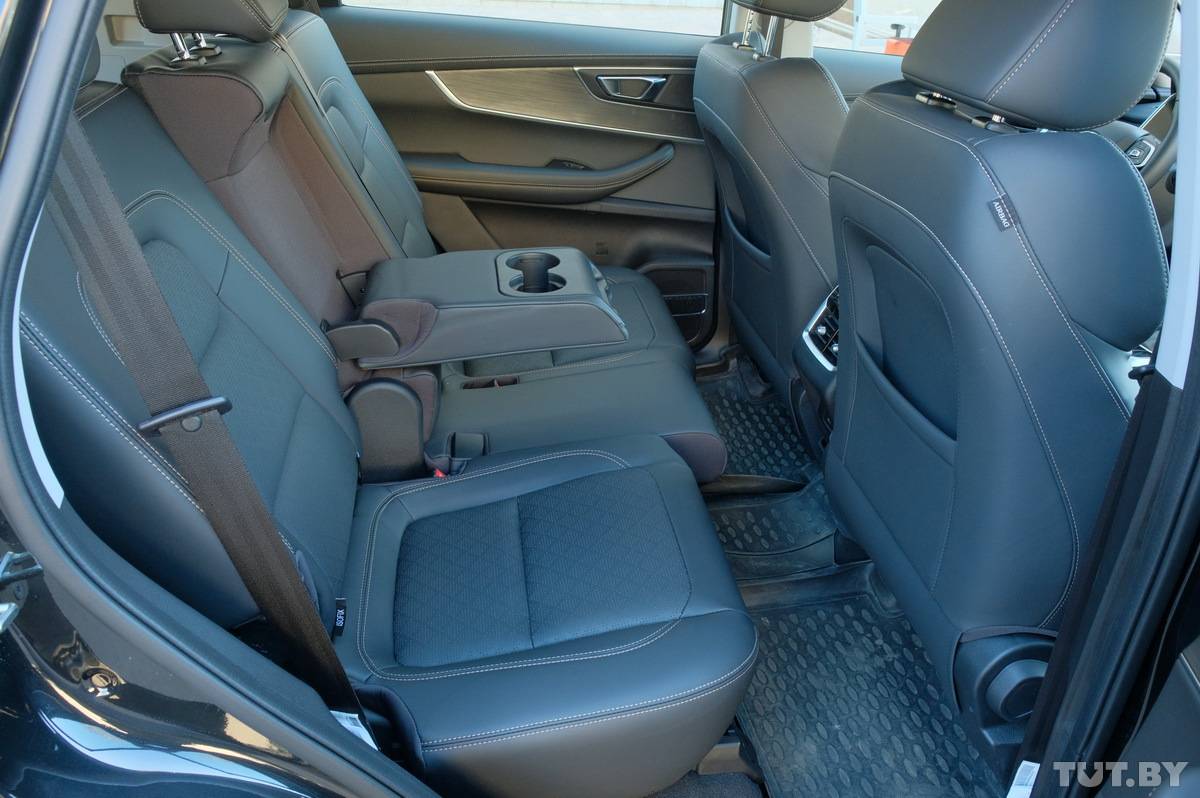 Средний ряд сидений — без претензий. Раздельные половинки можно двигать вперед-назад, менять угол наклона спинки, есть подлокотник с подстаканниками, USB-розетка для зарядки гаджетов и даже подогрев.