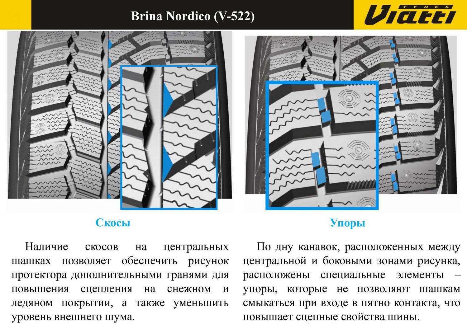 Протекторный рисунок шин Brina NordicoV 522 не похож на зимнюю резину других производителей. Разработчики постарались объединить в одном изделии свойства фрикционной резины и нордической шиповки.