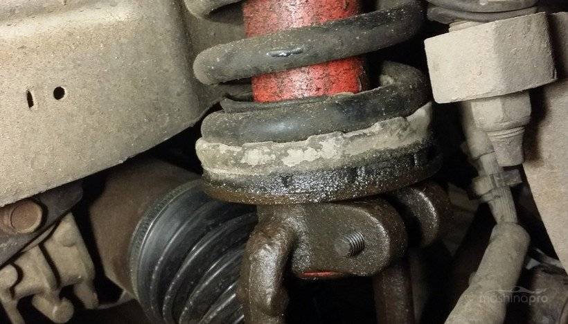 Верхняя часть опоры становится причиной тому, что на кочках появился глухой стук в передней подвеске. Резиновая основа служит демпферным гасителем от возможных лишних шумов. Но гибкость может теряться, и некогда, способная к возвратным деформациям основа, «деревенеет» и начинает изнашиваться.