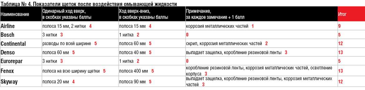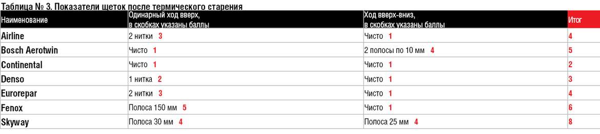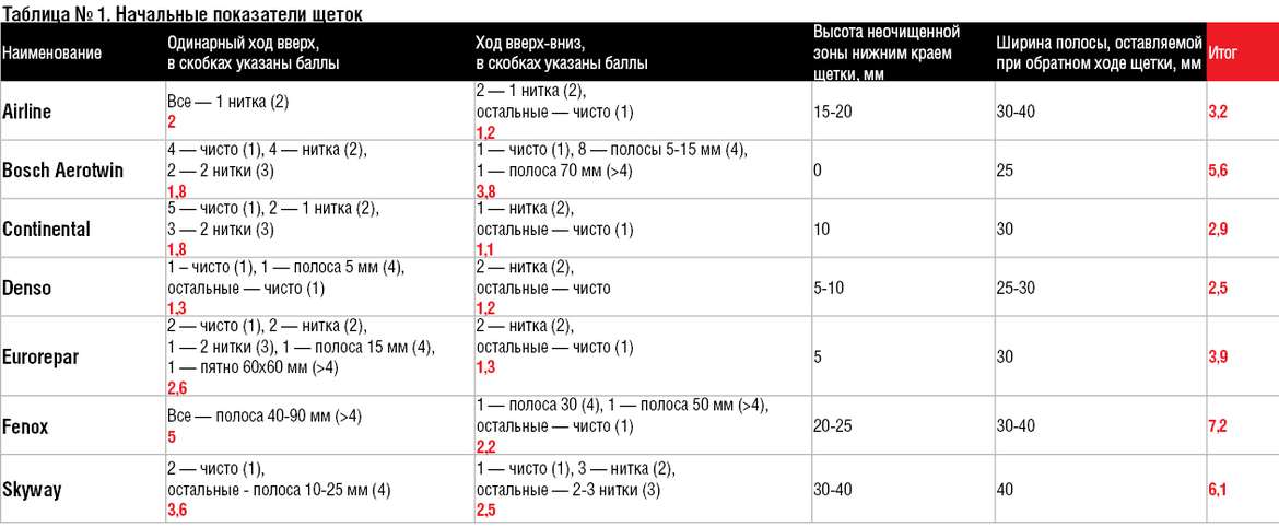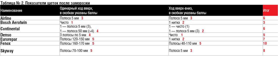 Проверка щеток после заморозки показала (см. таблицу № 2), что зимой щетки Fenox замерзнут, они не очищают стекло даже при двойном ходе. Дворники Continental, Eurorepar хотя и плохо чистят при одинарном ходе, но при этом оставляют почти чистое стекло при обратном. Самой морозоустойчивой оказалась Bosch.