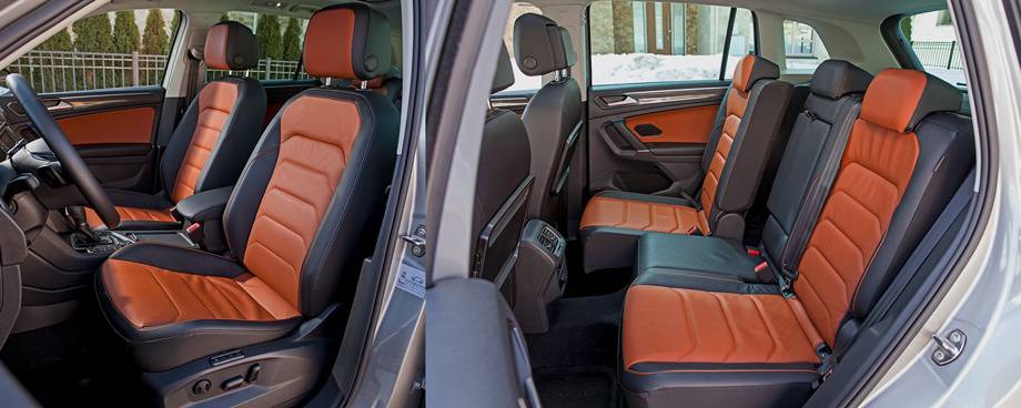 Немецкий SUV получил более жёсткий вариант посадки. Но менее комфортным автомобиль от этого не стал. У передних кресел тщательно продуманная анатомическая форма, отменная боковая поддержка и широкие возможности по регулировке. Высокий водитель и передний пассажир могут ощутить нехватку длины сиденья. На заднем ряду всё также хорошо, подушка анатомическая, удобные подголовники и возможность изменения угла наклона каждой спинки. Для сидений предусмотрено перемещение по полозьям. Тем самым каждый задний пассажир может выполнить индивидуальную настройку посадочного места под себя. Очевидный плюс в пользу Tiguan.