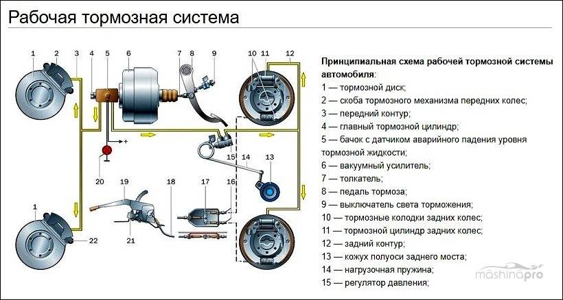 Под рабочей тормозной системой понимается совокупность деталей и узлов, которые обеспечивают штатную остановку транспортного средства. Ее устройство и схема работы описаны выше.