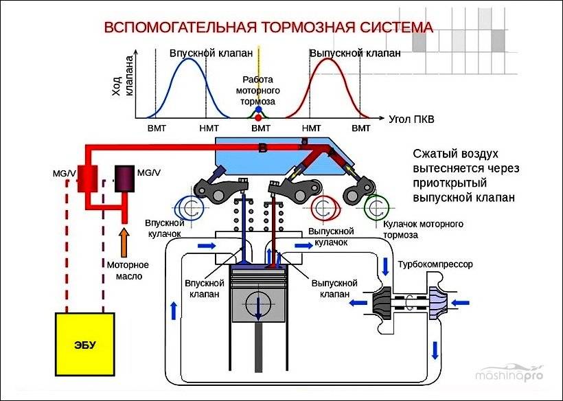 Горный тормоз применяется на грузовиках. Суть его заключается в принудительном сбросе оборотов двигателя при движении с горы, что позволяет замедлить авто без использования рабочего тормоза, чтобы исключить перегрев и отказ рабочих механизмов.