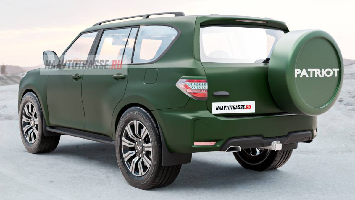 В сравнении с Nissan Patrol, корма у нового УАЗ Патриот оформлена в уникальной стилистике. Сверху над багажной дверью, размеры которой, как и остального кузова, существенно выросли, располагается небольшое антикрыло с тонкой лентой дополнительного стоп-сигнала. От текущей версии Патриота новинка позаимствовала схему размещения полнопразмерного запасного колеса. На представленной модели оно вынесено ближе к правой задней опорной стойке. Такое решение обусловлено тем, что багажная дверь у Патриота открывается не вверх, а в сторону, на что указывает находящаяся слева пластиковая ручка.