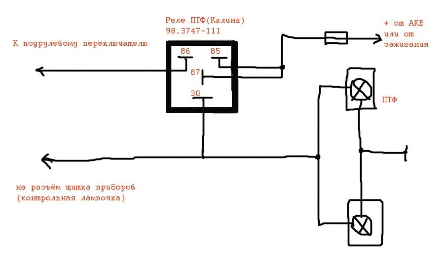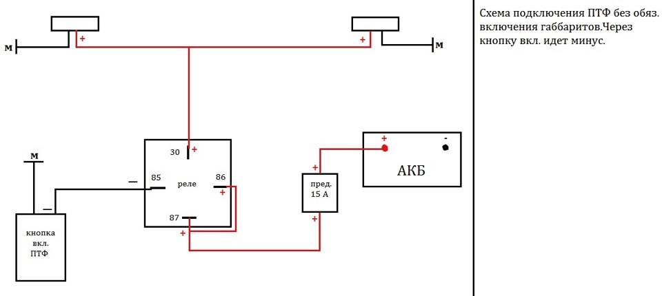 На практике, это позволяет избежать ситуаций, когда водители забывают выключить противотуманки при незаведенном моторе, что становится причиной разряда АКБ. Схема подключения противотуманок через реле указана на фото ниже. Далее, вставляют реле и предохранитель в специально отведённое гнездо, что не должно вызвать никаких затруднений. Провода питания следует прокладывать, чтобы они не проходили вблизи горячих или острых деталей машины.