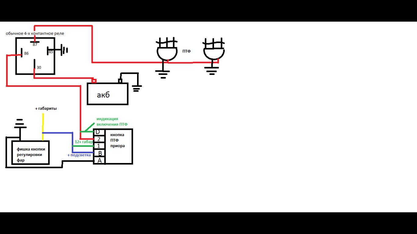 - мощность, которую потребляют противотуманки, требует подключения через реле, которое управляется кнопкой (см. фото);
