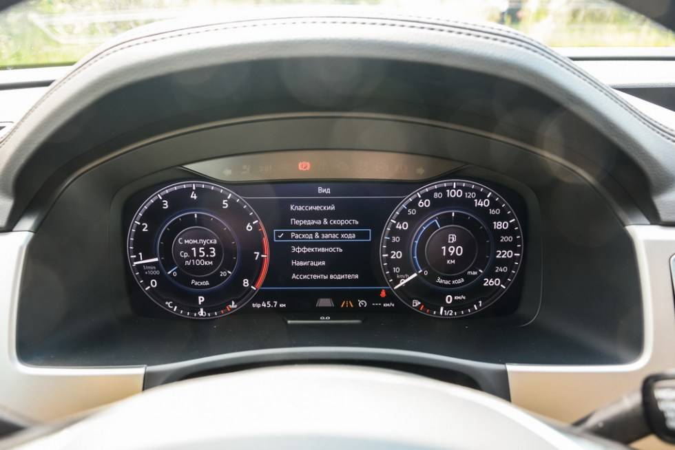 Начиная с версии Respect можно выбирать и двигатель — 3.6 VR6 будет дороже ещё на 200 тысяч, но прибавки в динамике от неё ждать не стоит: шестицилиндровый мотор на 0,3 с… медленнее набирает 100 км/ч, более прожорливый и не выгоден по налогу. Исполнение Status может похвастать памятью регулировок сидений, адаптивным круиз-контролем с системой автономного торможения, виртуальной приборной панелью и навигатором, но дороже ещё на 280 тысяч. Самый богатый по оснащению Exclusive начинается с отметки в 3,579 млн рублей и может похвастать кожаным салоном, камерами кругового обзора, панорамной крышей и ассистентом движения в полосе.
