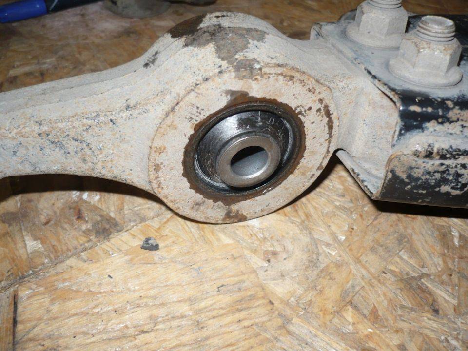 После – зачищается место установки от следов ржавчины, а новый сайлентблок смазывается жидким мылом, чтобы облегчить его монтажа. Выполняется запрессовка. Аккуратно затягивается фиксирующий болт.