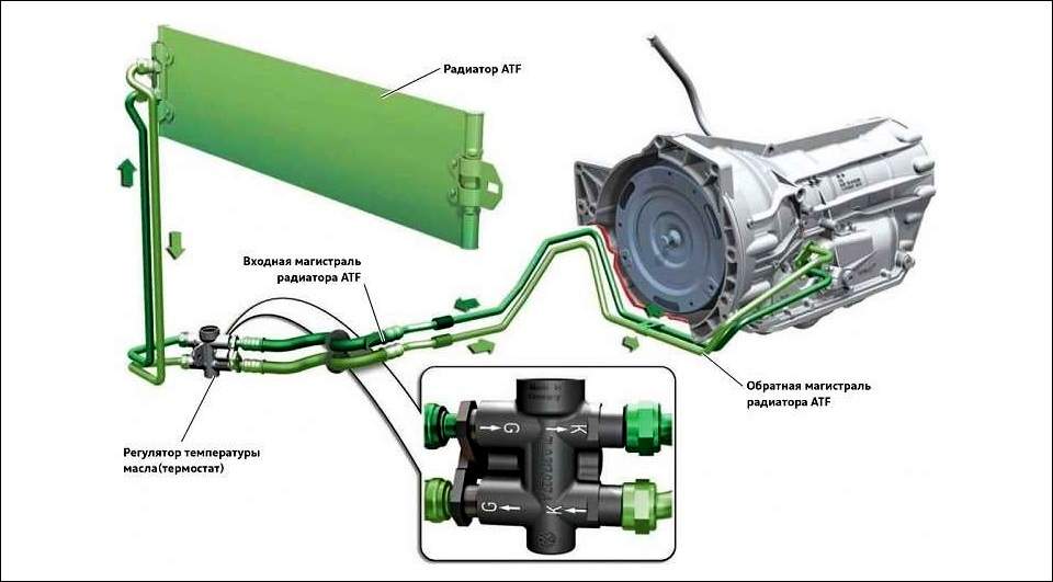 - Благодаря компрессору под давлением свежее масло будет поступать в поддон АКПП, там насос будет прокачивать его по системе в радиатор заменяя им отработанную жидкость;