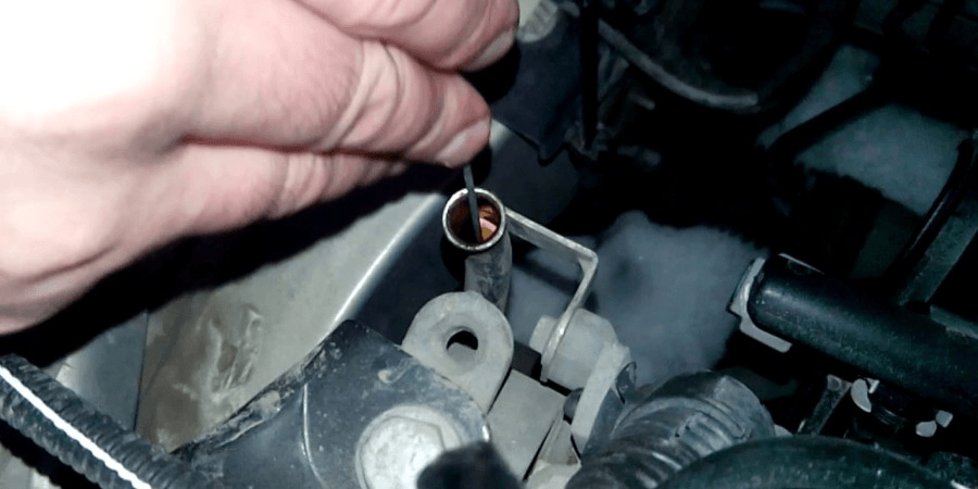 После того, как винт откручен, аккуратно ввести в емкость металлический стержень. Делать это строго перпендикулярно. Достать щуп и проконтролировать его состояние. Чистый щуп или небольшое количество масла свидетельствуют о том, что требуется доливка. Метод примитивный, но другого не предусмотрено. Еще раз стоит напомнить, что производитель вообще не рекомендую доливать или менять масло.