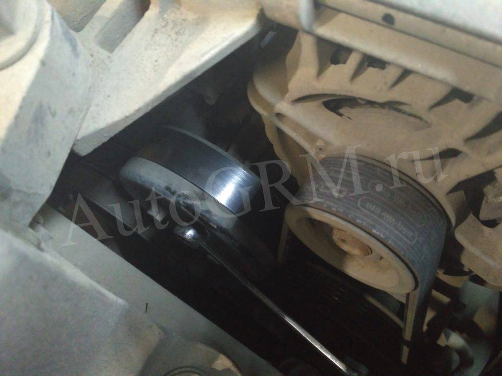 - Надеваем новый расходник на все шкивы (смещенный агрегат позволит это сделать);