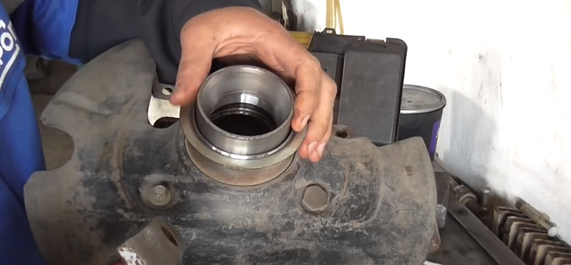 - Все запчасти необходимо очистить от грязи с помощью ветоши. После этого в кулак устанавливается внешнее стопорное кольцо. Запрессовать его можно при помощи старого кольца или оправки. Забивать подшипник не рекомендуется, поскольку это может привести к микротрещинам и быстрому разрушению.