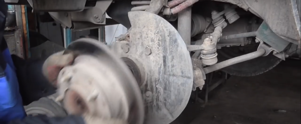 - Аккуратно снять ступицу вместе с поворотным кулаком, шаровыми опорами и тормозным диском.