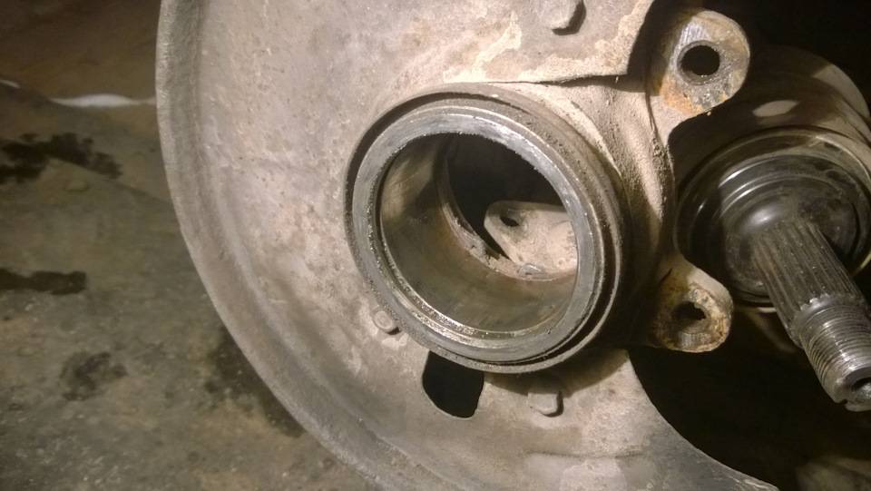 Но перед снятием кольца нужно снять пыльник (на фото он уже снят), и важно потом перед установкой ступицы не забыть поставить пыльник на место. Затем нужно снять стопорное кольцо, я снимал специальными щипцами
